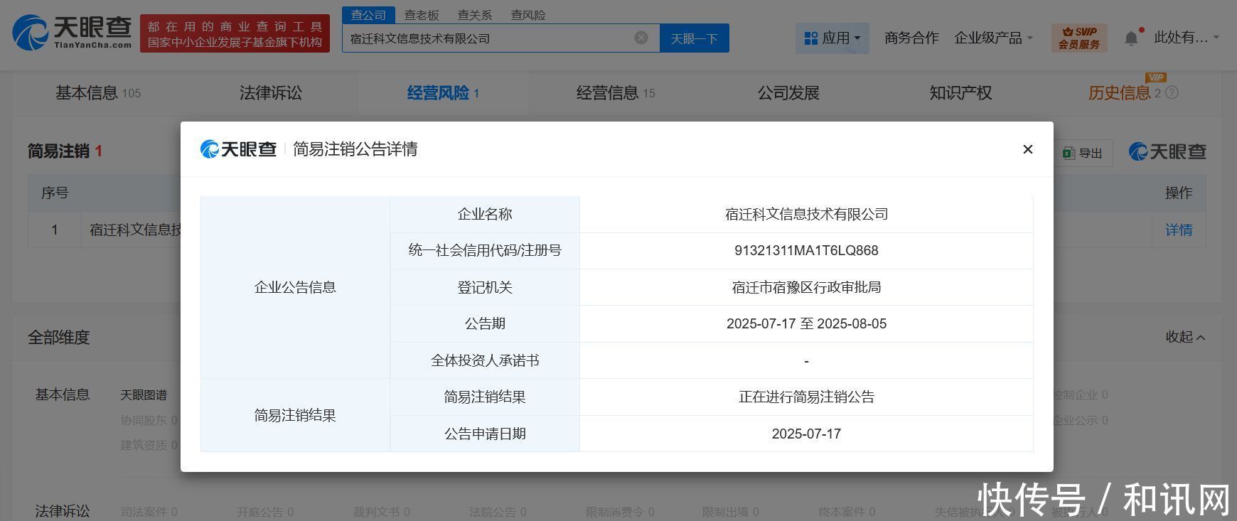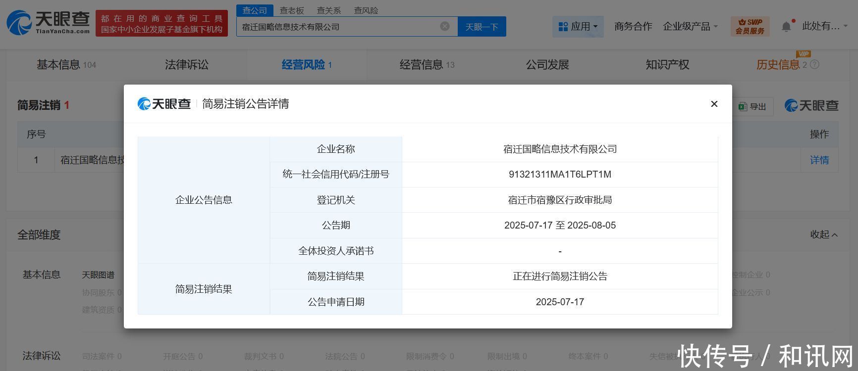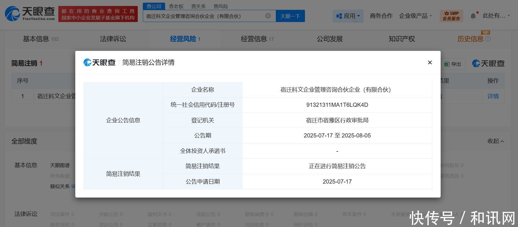 天眼查App显示前海吉安前海吉安,近日前海吉安,宿迁国略信息技术有限公司、宿迁科文信息技术有限公司、宿迁科文企业管理咨询合伙企业(有限合伙)新增一则简易注销公告,公告期自7月17日至8月5日。